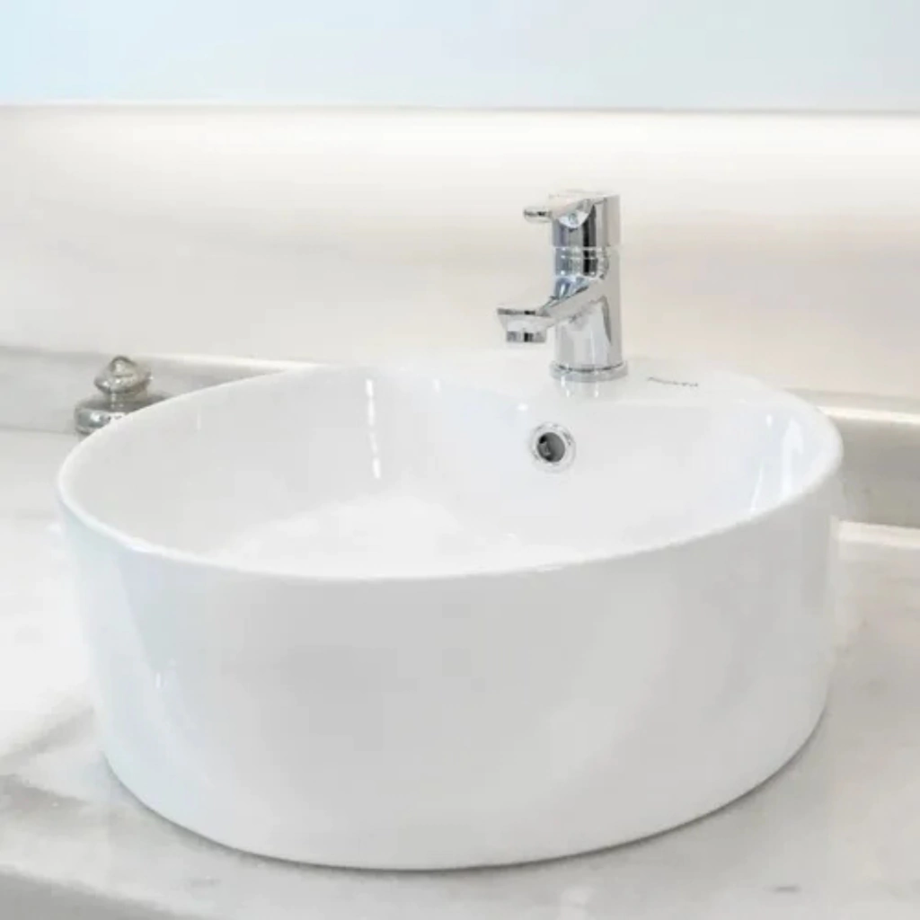 Se apoya sobre la mesada y cuenta con un agujero para grifería.